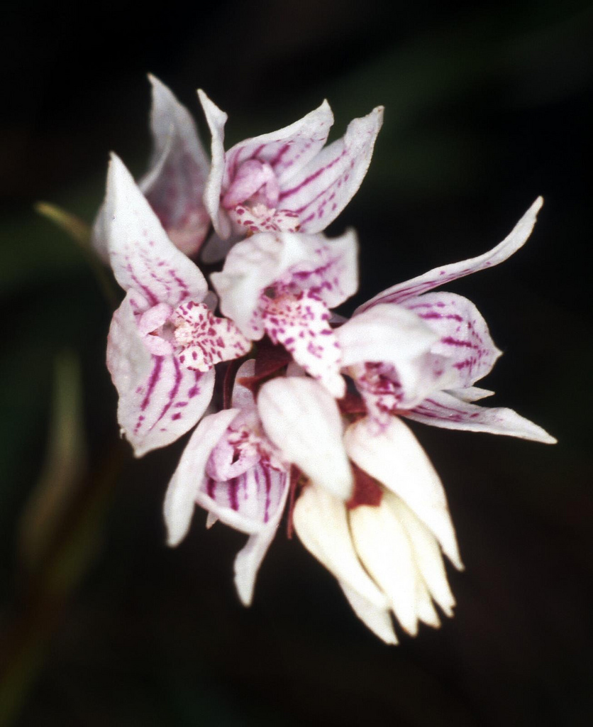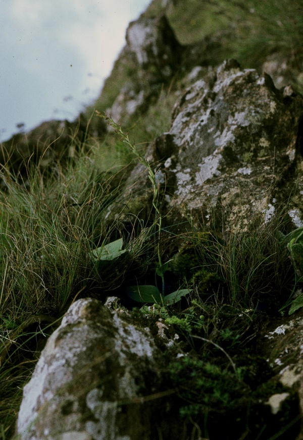 Found in Transvaal South Africa always on very steep rock ledges, presenting the inflorescence at a 45' angle, in montane grasslands at elevations of 1600 to 2300 meters as a small to medium sized, cool to cold growing terrestrial with 2 to 3 lower, narrowly elliptic, upper, reducing in size, lanceoalte leaves that blooms in the spring on an arching, densely 6 to 25 flowered inflorescence.