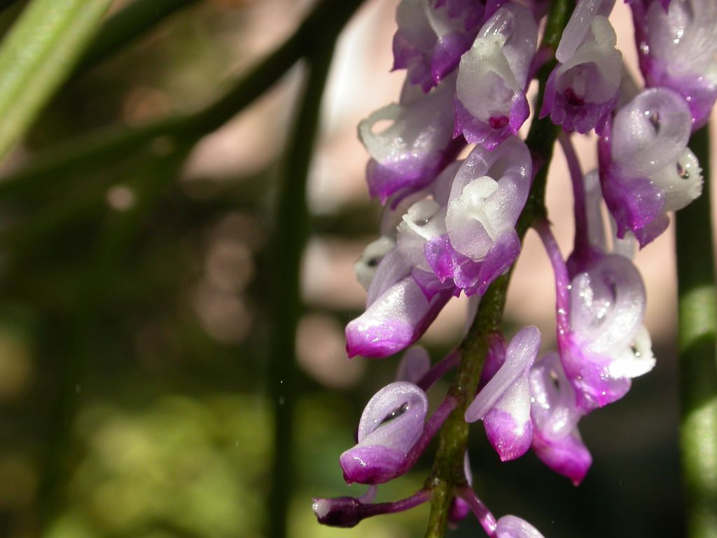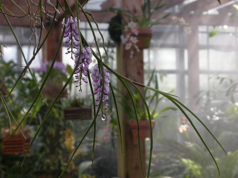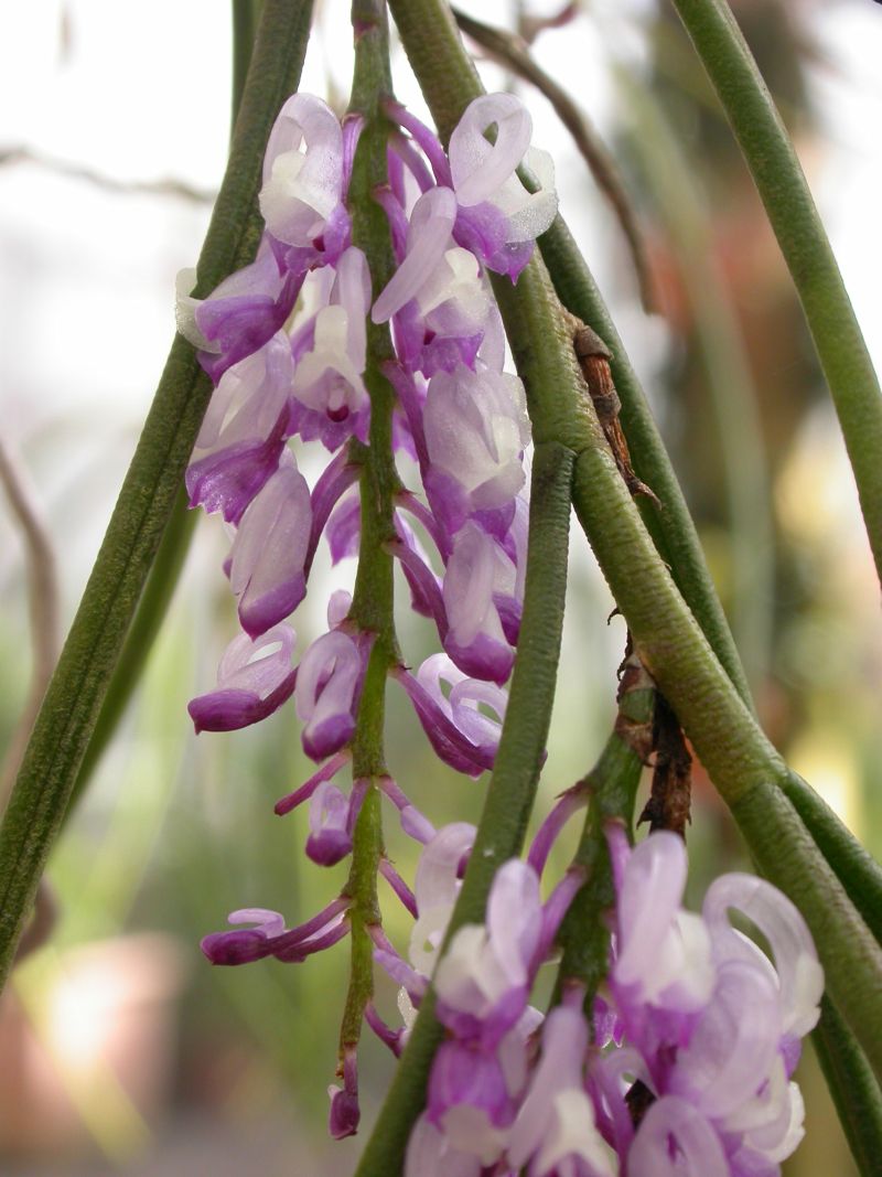 A pendant, monopodial, small to large sized, warm to cool growing epiphyte that is found in Java, Borneo and Sumatra in lower montane forests at elevations around 750 to 1800 meters with a pendulous, freely branching stem carrying terete, acute leaves often flushed with violet that blooms in the early summer on several at a time, axillary but towards the apex, racemose, to 4" [10 cm] long, densly many flowered inflorescence with triangular, acute floral bracts and flowers that open in succession but do not open widely.
