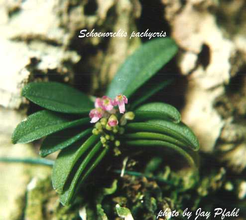 SUBFAMILY Epidendroideae, TRIBE Vandeae, SUBTRIBE Sarcanthinae. Schoenorchis consists of 10 species in Asia from the Himalayas to New Guinea. They are small, epiphytic, narrow leafed with keikisand roots most often forming only at the base of the plant. The inflorescence can be branching or simple and are multiflowered. The flowers have sepals and petals that are scarcely spreading with a 3 lobed spurred lip and a short column with a long beaked anther. There are 4 pollina, each 2 united and attached to a long thin viscidum. It was established as a genus by Blume in 1825 and his type species was Schoenorchis juncifolia.