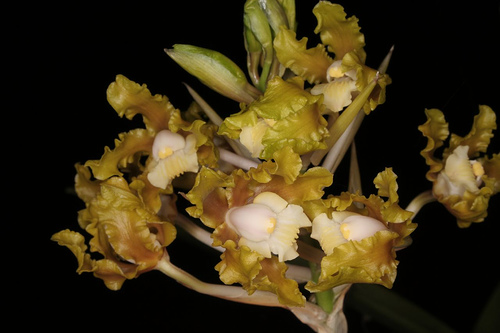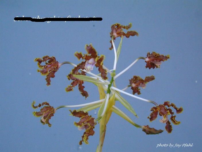Found from Colombia, Venezuela, Fr Guyana, Guyana, Surinam and Northern Brazil at lower elevations as a large sized, hot to warm growing epiphyte with clavate-fusiform, compressed, angled and sulcate pseudobulbs enveloped in youth by several membraneous, acute sheaths and carrying 2 apical, rigid, coriaceous, erect-patent, apically recurved, oblong, cuneate and lightly concave below into the base leaves that blooms in the summer on a racemose to sub-umbellate, many flowered, 24 to 44" [60 to 110 cm] long, robust, terete inflorescence.