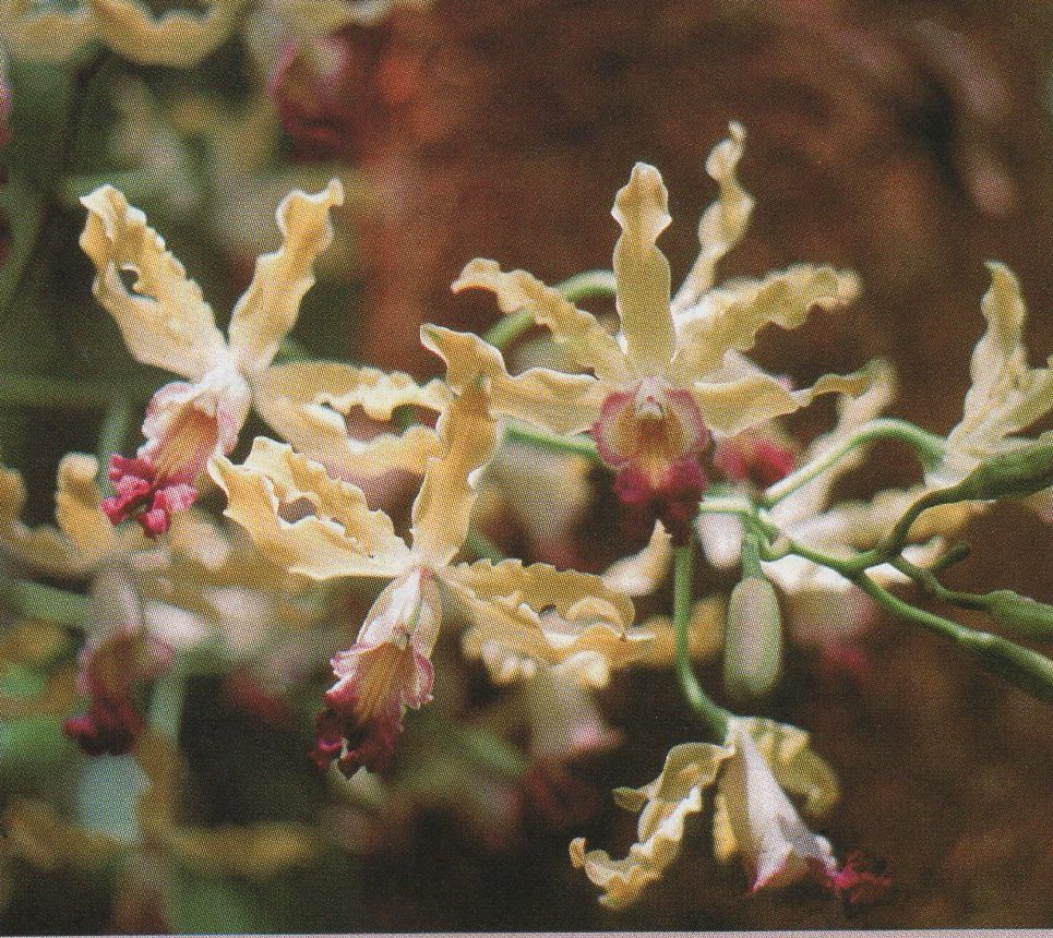 Found in the Cayman Islands as a small sized, hot growing epiphyte in scrubby bushes close to the sea and exposed to full sun with curved, hollow pseudobulbs carrying a few apical, elliptic-ovate leaves that blooms in the spring and summer on an erect, to 4' [120 cm] long, sometimes branched inflorescence from which arise several to many [12 to 20] successively opening, fragrant flowers occuring over a long period.