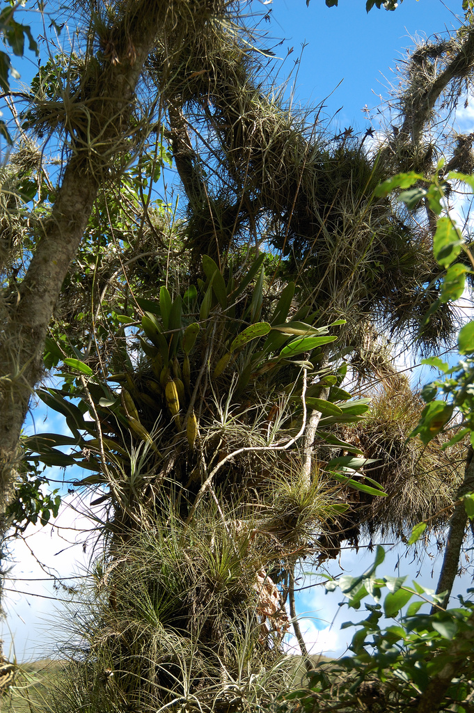 Found in Bolivia and Peru in tropical rainforest as a large sized, hot to warm growing epiphyte with fusiform pseudobulbs carrying 2 apical, linear-ligulate leaves that blooms in the winter and spring on an erect, 36" [1 m] long, racemose inflorescence with rose colored bracts, white ovary and an apical cluster of many [20 to 25] flowers.