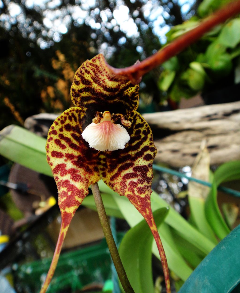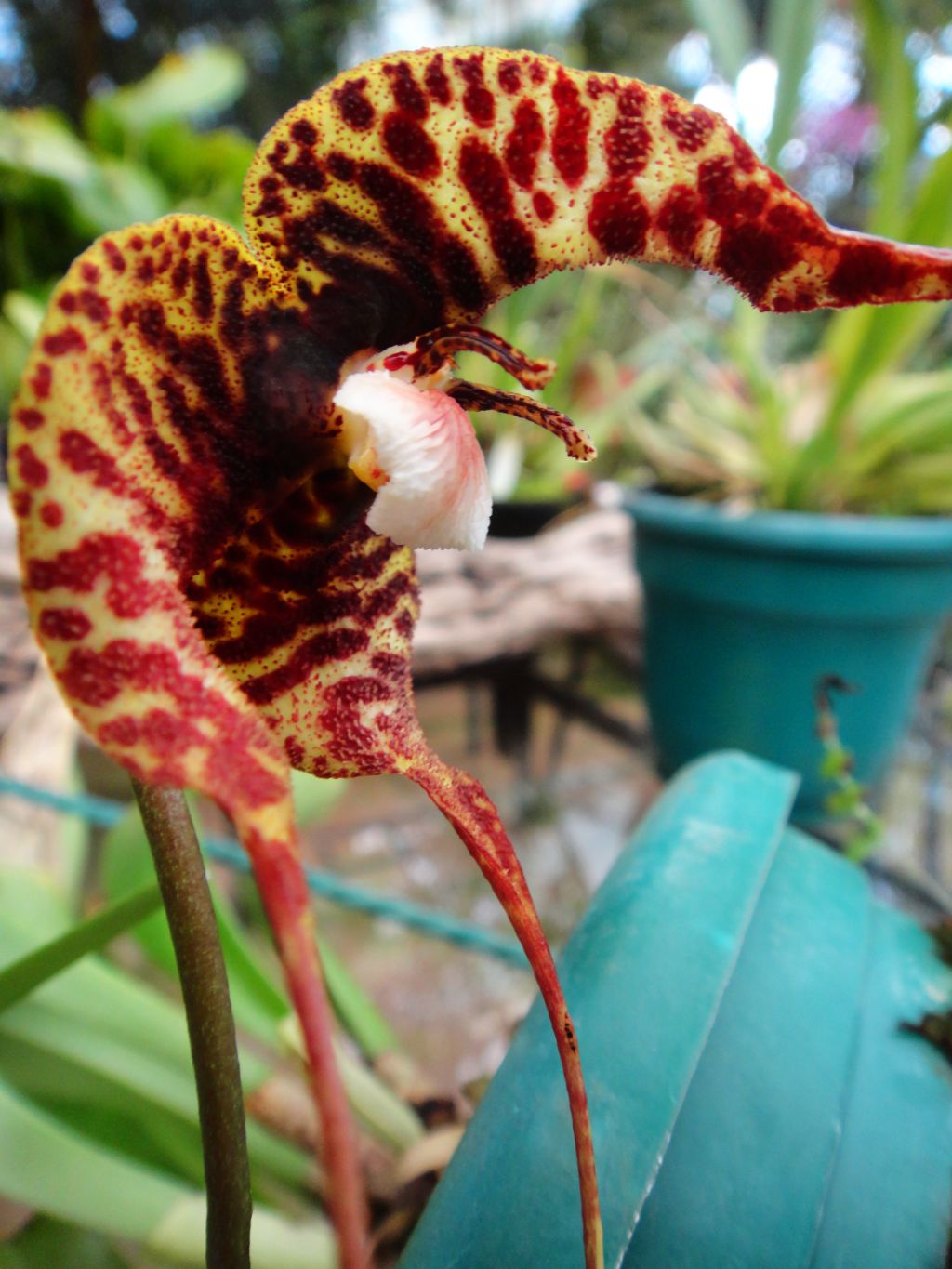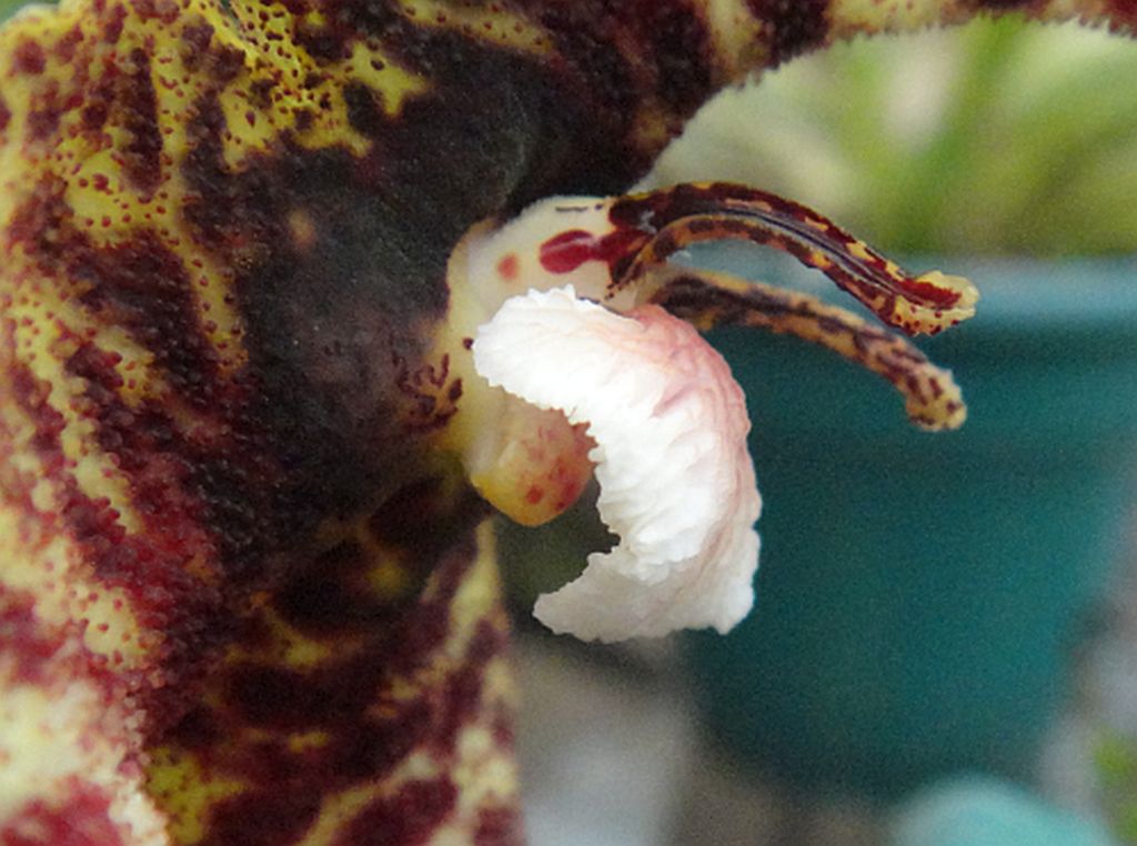 Found in Colombia and Ecuador in cloud forests at elevations of 1500 to 2200 meters as a small sized, cool to cold growing epiphyte found low down on tree trunks with erect, stout rramicauls enveloped basally by 2 to 3, loose, tubular sheaths and carrying a single, apical, erect, thinly coriaceous, carinate, elliptical, subacute, gradually narrowing below into the conduplicate, subpetiolate base leaf that blooms in the late fall and winter on a descending, stout, few bracted, green with white flecked, successively few flowered, racemose, 6 to 8" [15 to 20 cm] long inflorescecne arising from low on the ramicaul with tubular floral bracts and carrying the large bizarre flowers below the leaves.