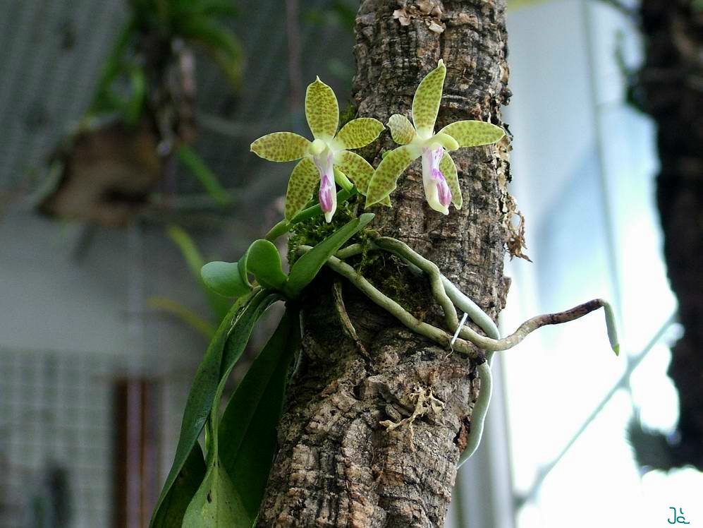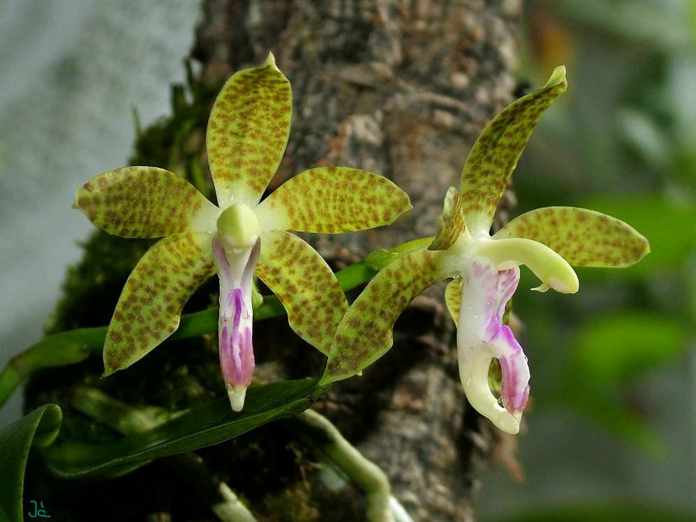 Found in southern China on tree trunks in wooded slopes at elevations of 300 to 1100 meters as a mini-miniature sized, hot to cool growing epiphyte with a short stem carrying several, oblong to obovate-lanceolate, slightly obtuse-bilobed apically, amplexicaul and clasping base leaves that blooms in the early spring and summer on an arching, racemose, to 3.6 to 4" [9 to 10 cm] long, laxly several flowered inflorescence carrying slightly fleshy, scented flowers