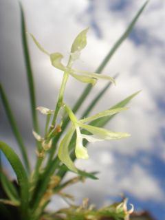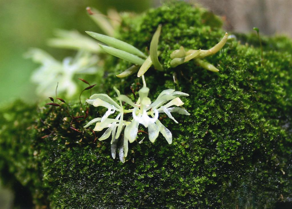 Found in Bolivia on very mossy trees in wet mossy, cloud forests at elevations around 1800 meters as a mini-miniature sized, cool growing epiphyte in bright light with terete acute leaves held in a fan-shape, and blooms on a pendant, 1" [2.5 cm] long umbel of a few flowers.