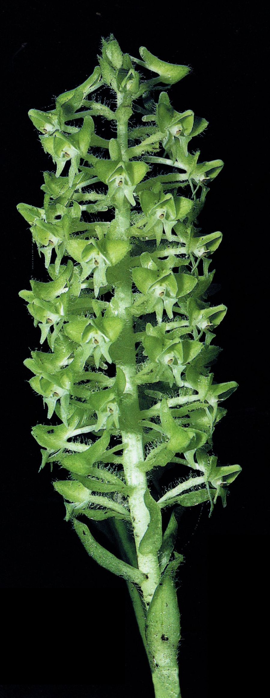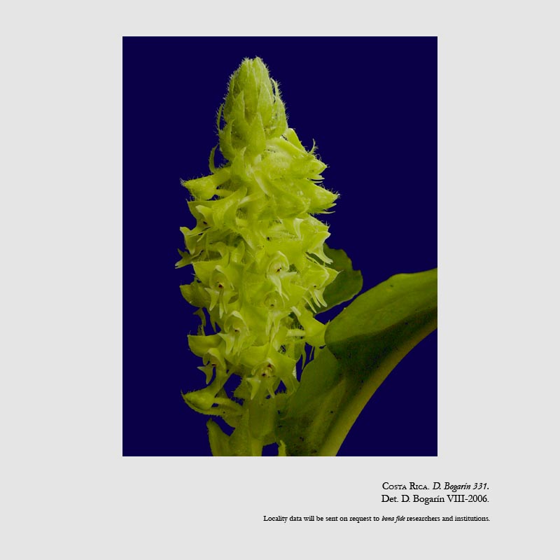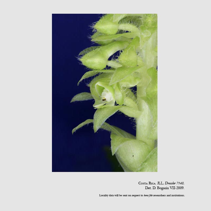 Found in Costa Rica and Panama at elevations around 1500 to 1800 meters as a small to medium sized, warm to cool growing terrestrial with a short, creeping stem carrying 4 to 5, basal, thin, convolute, broadly elliptical-ovate, 7 veined leaves that blooms in the later summer on an erect, terminal, 8 to 10" [20 t o25 cm] long overall, rachis to 6" [15 cm] long, subdensely many flowered inflorescence enveloped by rather broad sheaths and lanceolate, longer than the ovaries floral bracts and carrying non-resupinate flowers.