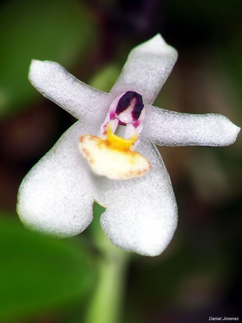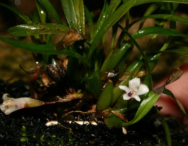 Found from Guatemala, Costa Rica and Panama at elevations around 1000 to 1100 meters as a mini-miniature sized, cool growing epiphytic orchid with narrowly ovoid to cylindric, approximate pseudobulbs enveloped in youth by 1 to 2 foliaceous sheaths and carrying a single apical, thin, narrowly elliptic to oblong, obtuse, gradually narrowing below into the petiolate base leaf that blooms in the fall on a to .6" [1.5 cm] long, basal, single flowered inflorescence subtended by a acuminate floral bract.