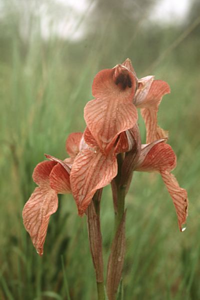 Found in France, Italy, and the islands of Corsica, Sardinia and Sicily as a small sized, cold to cool growing terrestrial orchid of wet grasslands, olive groves, scrub and light pine forests at elevations below 600 meters with 2 ovoid tubers giving rise to 4 to 10, ovate to linear-lanceolate leaves that blooms on an erect, terminal, 12" [30 cm] long, laxly few [2 to 8] flowered inflorescence, that has large bracts that almost cover the flower occuring in the spring.