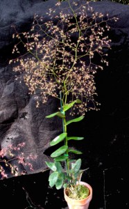 Found in Cuba, Jamaica, San Luis Potosí, Querétaro, Hidalgo, Veracruz, Oaxaca, Chiapas and Quintana Roo states of Mexico, Guatemala and Belize at elevations of sea level to 1600 meters rarely 2200 meters as a small to medium sized, hot to cool growing, reed stem epiphyte with clumped, simple, cane-like, with a short rhizome at the base, terete at the base, laterally compressed above, erect or arching, flexuous stems carrying 3 to 11, all along the stem, distichous, laterally compressed, imbricating leaf bases, coriaceous, green, the margin and underside frequently reddish, ovate-elliptic to oblong-lanceolate, obtuse to bilobed leaves that blooms in the spring and early summer on a terminal, erect, peduncle short, straight, without bracts, rachis terete, reddish, 12" [30 cm] long overall, paniculate, much branched, branches with triangular, acute bracts, simultaneoulsy 60 to 300 flowered inflorescence with much shorter than the ovary, triangular, acute, scarious floral bracts withresupinate, small, membranaceous, yellowish green to reddish green, translucid flowers with a greenish column, reddish when dry and without fragrance.
