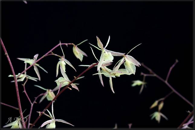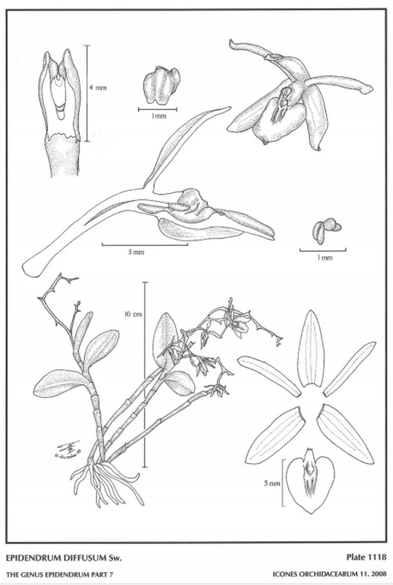"Epidendrum diffusum belongs to the GROUP Seraphyta and is recognized by simple stems, numerous elliptic to lanceolate- elliptic leaves, and a much branched, paniculate inflorescence, up to twice the length of the stems, with many, very small, delicate, translucent flowers with an entire, ovate-cordiform lip; when dry the whole specimen turns conspicuously reddish." Hagsater etal 2008