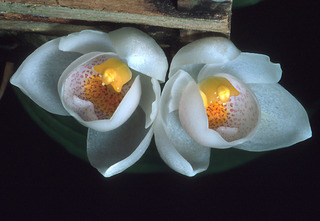 Found in Chocle province of Panama at lower elevations as a small sized, hot to warm growing epiphyte with clustered, broadly ovoid, somewhat ribbed pseudobulbs carrying a single, apical, plicate, elliptic, coriaceous, gradually narrowing below into the petiolate base leaf that blooms in the fall and spring on a pendant, basal, 1 to 3" [2.5 to 7.5 cm] long, few flowered inflorescence with ovate, papery bracts and acute, short dark haired, papery floral bracts.