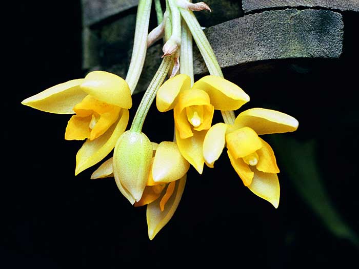 Found in Colombia, Panama, Costa Rica and Nicaragua in lowland tropical rainforests as elevations of 100 to 1000 meters as a small sized, warm to hot growing, caespitose epiphyte with pyriform, longitudinally sulcate pseudobulbs enveloped by several basal bracts and carrying a single, apical, elliptic-lanceolate, coriaceous, plicate, gradually narrows below into the long, channeled, petiolate, ribbed leaf that blooms on a basal, short to 2" [5 cm], pendulous, 3 to 12 flowered inflorescence arising on a mature pseudobulb occuring in the late spring and early summer.