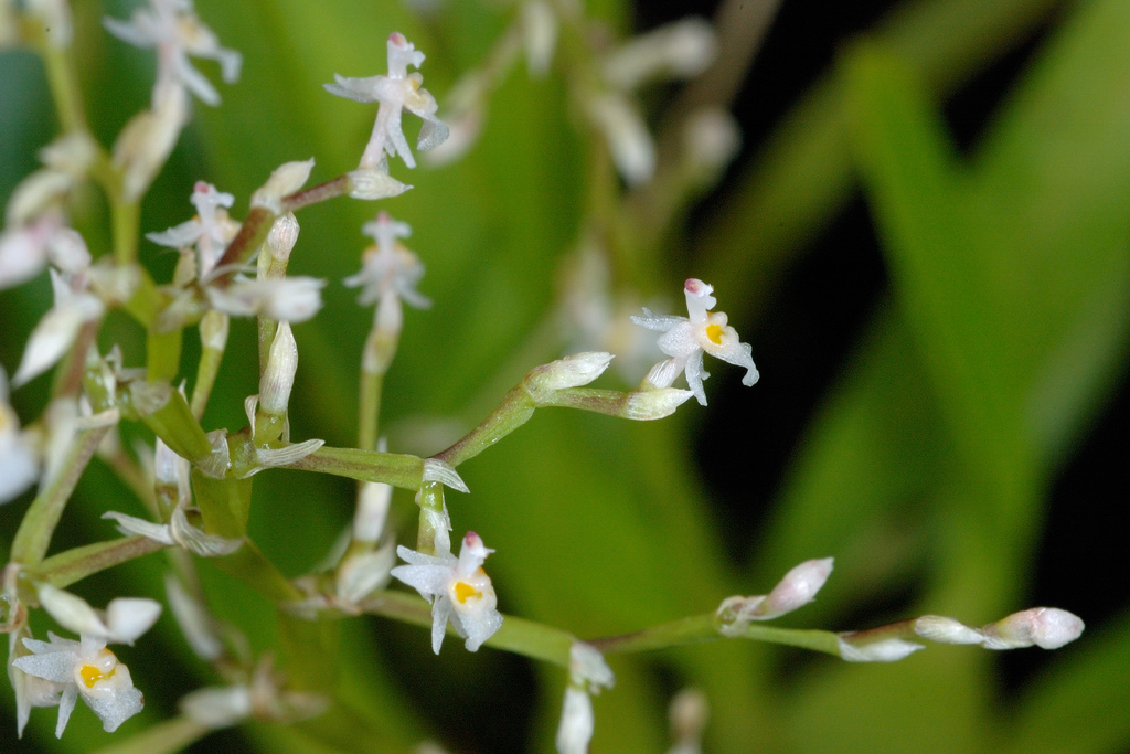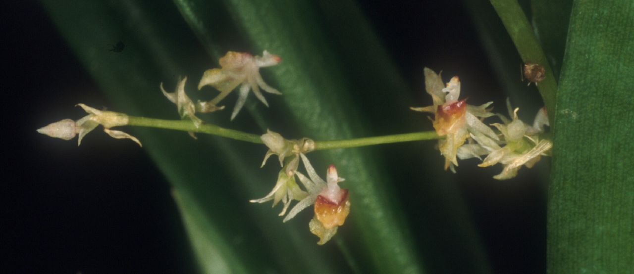 Found in Valle de Cauca department of Colombia, Western Ecuador and Costa Rica? in orange and Guava trees in montane cloudforests at elevations of 100 to 1250 meters [yet most common between 400 to 900 meters] as a small sized, hot to warm growing epiphyte with a rhizome carrying closely spaces growths made up of narrowly egg-shaped, compressed pseudobulbs with 2 sharp edges and basally enveloped by several distichous, overlapping, longitudinally folded sheaths with the upper most few carryiong leaf like blades and carrying an apical, single, narrowly linear to strap shaped, acute leaf that blooms in the winter and spring on a slender, erect to arching, 7.5" [19 cm] long, many flowered, paniculate inflorescence arising on a newly matured pseudobulb from with in the leaf axil