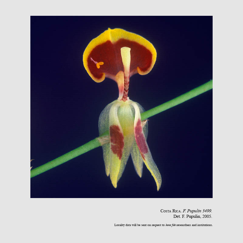 Found in Costa Rica in lower montane forests at elevations around 1050 meters as a mini-miniature sized, warm growing epiphyte with elliptic-ovate, compressed pseudobulbs enveloped basally by 3 to 5, distichous, green flushed with purple-brown, some foliaceous sheaths carrying subcoriaceous, linear-ligulate, obliquely bilobulate apically, narrowing below into the conduplicate, petiolate base leaf that blooms in the late fall and early winter on a lateral, erect-spreading, slender, apparently secund, much longer than the leaves, to 8.8" [22 cm] long, successively several flowered inflorescence with flowers subtended by papyraceous bracts and lanceolate, acute, scarious, almost as long as the pedicel floral bracts.