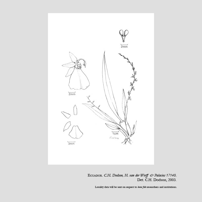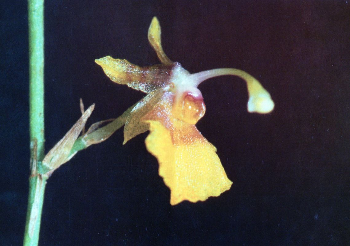 Found in northwestern Ecuador at elevations around 700 to 850 meters as a miniature sized, warm growing epiphyte with ovate, flattened, ancipitous pseudobulbs enveloped basally by several, conduplicate sheaths with the uppermost being leaf bearing and carrying narrowly elliptic-oblong, acute, narrowing below into the conduplicate, petiolate base leaves that blooms in the winter through summer on a lateral, basal, through the uppermost leaf axils of the sheaths, erect, to 6" [15 cm] long, paniculate, shortly branched, each branch successively single flowered over a prolonged time inflorescence with several, remote, close tubular bracts.