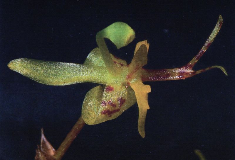 Found in northwestern Ecuador at elevations of 720 to 900 meters as a mini-miniature sized, warm growing epiphyte with cylindrical, slightly swollen pseudobulbs carrying a single, apical, narrowly elliptic, sub acute, gradually narrowing below into the petiolate base leaf that blooms in the winter, spring and summer on a terminal, erect, 3" [7.5 cm] long, well spaced, few flowered inflorescence with 2 to 3 acuminate bracts.