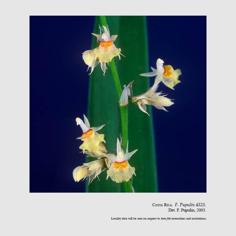 Found in Costa Rica in premontane forests on shaded branches and twigs at elevations of 300 to 1000 meters as a miniature to small sized, hot to warm growing epiphyte with elliptic to ovoid, compressed pseudobulbs enveloped basally by 2 to 4 distichous, foliaceous sheaths and carrying a single, apical, green, subcoriaceous, linear-lanceolate, acute, narrowing below into the short, conduplicate, petiolate base leaf that blooms in the later spring on a lateral, to 8" [20 cm] long, paniculate, progressively elongating lateral branches, successively several flowered inflorescence with short, membraneous, triangular-ovate, acute floral bracts.