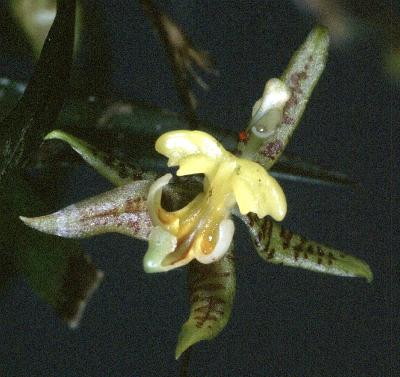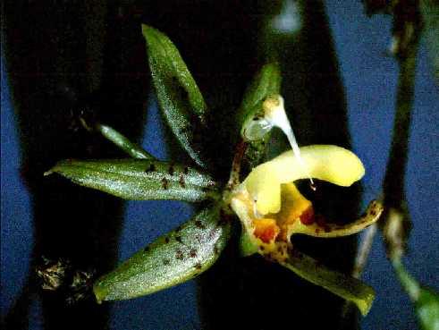 Found in Colombia as a small sized epiphyte with a flattened, longitudinally grooved pseudobulbs partially enveloped basally by a few distichous, imbricating, longitudinally folded leaf bearing sheaths carrying a single, linearto strap-shaped, bluntly pointed leaf that blooms on a to 5" [to 12.5 cm] long, axillary, paniculate inflorescence arising from the leaf axil of the leaf bearing sheath with several successive flowers