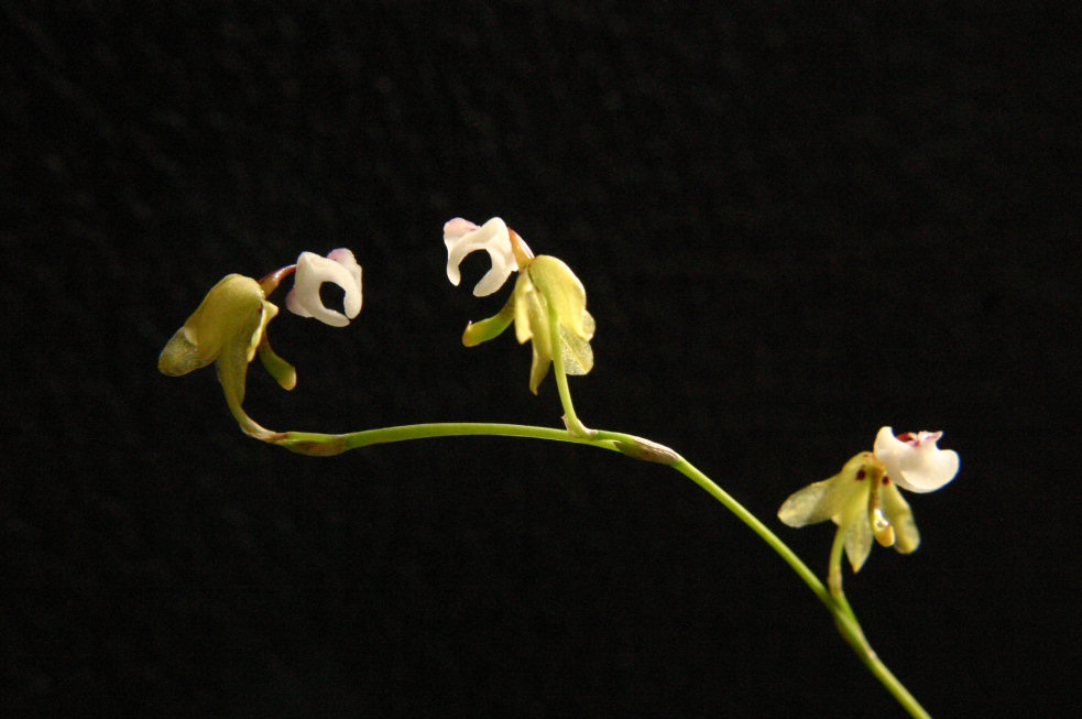 Found in Guerrero state of Mexico in oak-pine forests at elevations around 1000 meters as a small sized, warm growing epiphyte with close set, ovate to narrowly ovate, laterally flattened, ancipitous pseudobulbs enveloped basally by several distichous, imbricating, conduplicate, uppermost leaf bearing sheaths and carrying a single, linear to linear-elliptic, acute, narrowing below into the fairly long, narrow conduplicate base leaf that blooms in the fall and winter on an arching, basal, along the axil of an upper sheath, to 6" [to 15 cm] long, laxly several flowered inflorescence .