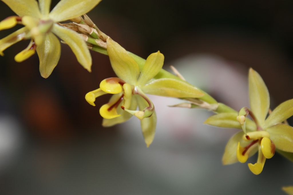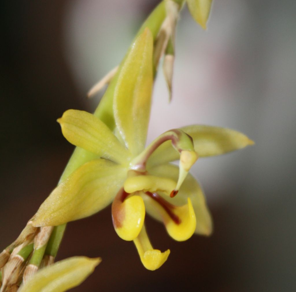 Found in Antioquia state Colombia as a miniature to small sized, warm to cool growing epiphyte with egg-shaped, strongly compressed pseuodbulbs enveloped partially by several distichous, imbricating, conduplicate, leaf-bearing sheaths and carrying a single, apical, narrowly oblong-lanceolate, acute, thin, leathery leaf that narrows below into a conduplicate short stem that blooms in the spring on an axillary, erect to ascending, compressed laterally with 2 sharp edges, shortly paniculate, 5 to6" [12.5 to 15 cm] long, several successively flowered inflorescence with each branch carrying a single successive flower..