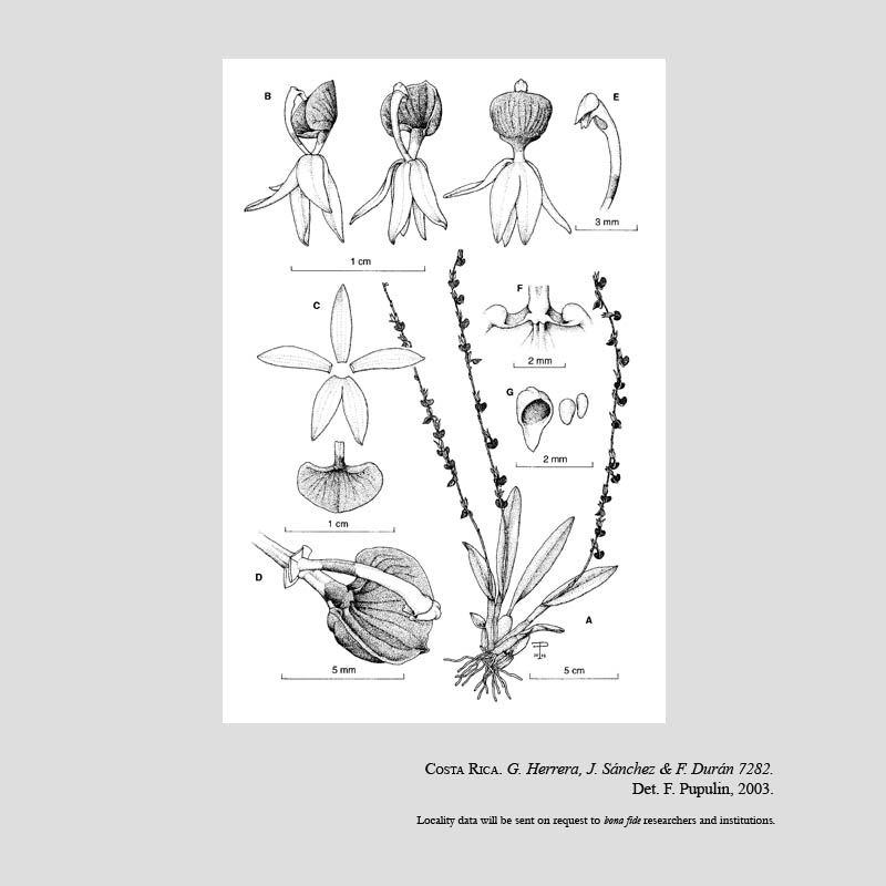 Found in Costa Rica near the Savegre river in humid, lower montane forests at elevations of 1300 to 1700 meters as a mini-miniature sized, cool growing epiphyte with elliptic, laterally compressed pseudobulbs enveloped basally by 5 to 7, distichous, uppermost foliaceous, green flushed purple sheaths and carrying a single, apical, subcoriaceous, narrowly elliptic, obtuse to minutely bilobulate, narrowing below into the shortly conduplicate, petilolate base leaf that blooms in the late spring through summer on 1 to 3, lateral, erect, slender, much longer than the leaves, to 9.2" [23 cm] long, successively several flowered inflorescence carrying strongly reflexed flowers that are subtended by clusters of papyraceus bracts.