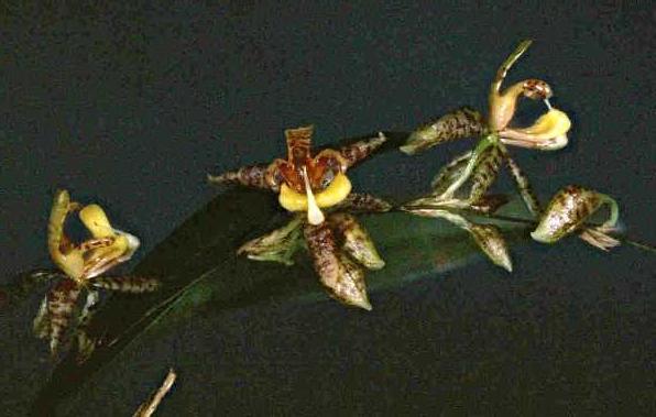 Occurs in Colombia around elevations of 1800 meters as a miniature sized, cool growing epiphyte with narrowly egg-shaped, bright, shiny, flattened, sharp-edged, longitudinally rugose pseudobulbs carrying a single, apical, dark green, linear to linear-lanceolate, acute leaf that is conduplicate basally and blooms in the spring on an axillary, 2 1/2 to 6" [6 to 15 cm] long, several flowered, paniculate inflorescence with the successively single flowers arising in clusters on short branches