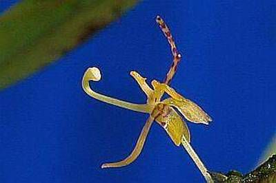 Found in Ecuador as a miniature sized epiphyte with elliptical, smooth to wrinkled, strongly compressed pseudobulbs enveloped basally by 1 to 2 leaf-bearing sheaths and carrying a single, apical, narrowly elliptical, acute leaf that narrows below into a conduplicate, short, narrow stem that blooms in cultivation in the fall on an axillary, to 6" [15 cm] long, erect for 2" then arching to horizontally spreading successively few flowered inflorescence that arises from the conduplicate leaf axil