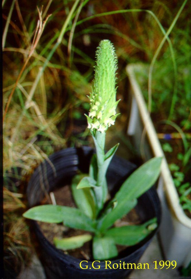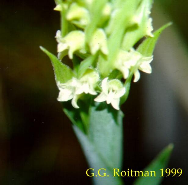 A medium to large sized, hot to warm growing terrestrial orchid found in Paraguay with an erect stem enveloped by leaf bearing sheaths carrying elliptic, obtuse, graduakky narrowing below into the broadly conduplicate, petiolate base leaves grading to leaf-like bracts above that blooms on an erect, terminal, densely many flowered inflorescence with linear, acute, longer than the flower floral bracts.