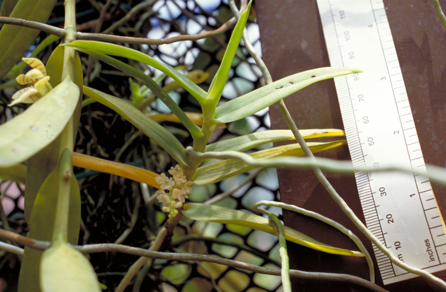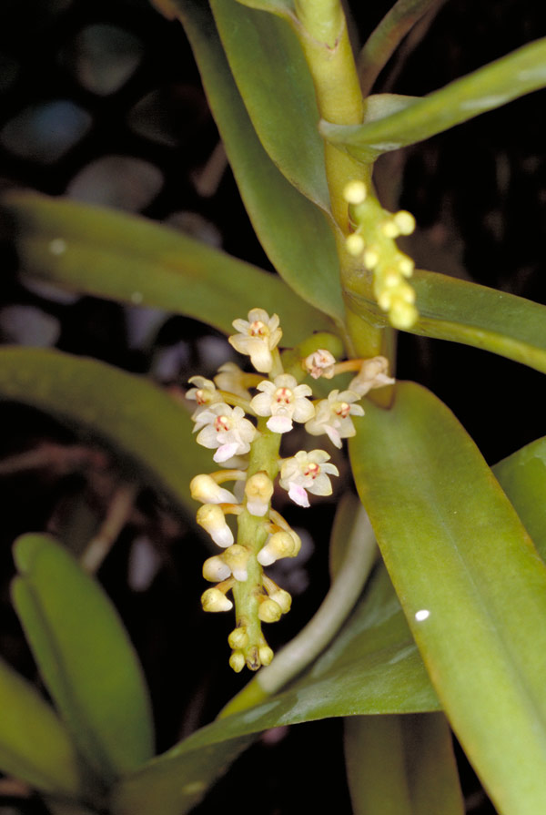 Found in Sulawesi in lowland and swamp forests sometimes on mangroves at very low elevations as a mini-miniature sized, hot growing epiphyte with clump-forming, freely branching stems carrying distichous, elliptic obtuse leaves that blooms in nthe fall on many, arching out and downwards, 1.4 to 2" [4 to 5 cm] long, successively 8 to 10 at any one time to 40 flowered inflorescence