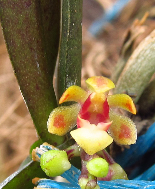 Found in southern India in semi-evergreen forests at elevations of 100 to 200 meters as a miniature sized, hot growing epiphyte with a very short stem carrying 2 to 4, distichous, coriaceous, elliptic-oblong leaves that blooms in the spring on 1 to 2, from beneath the leaves, shorter than the leaves, bracteate, 4 to 8 flowered inflorescence and carrying sessile, straw colored flowers with red spots.