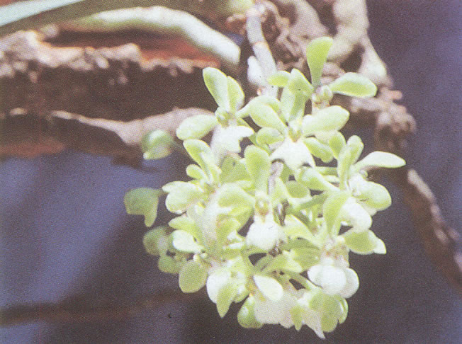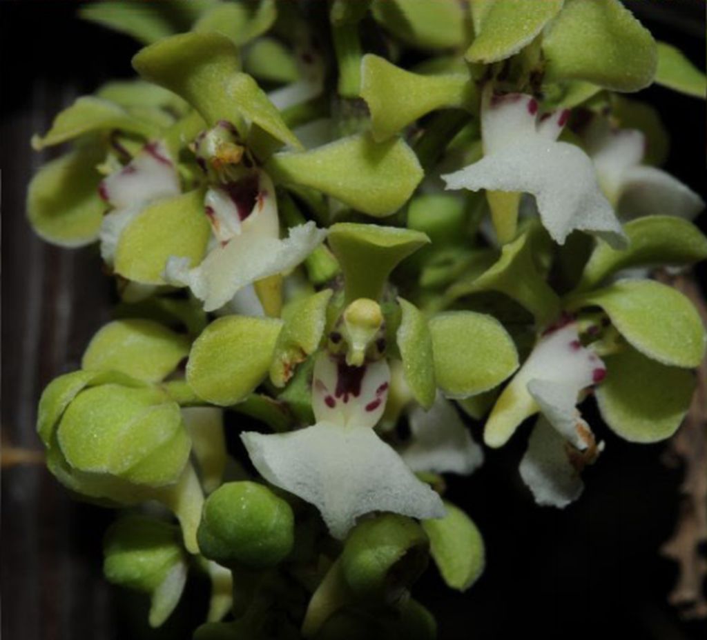 Found in southwestern India n semi-evergreen and evergreen forests as a miniature sized, warm growing epiphyte with a short stem carrying 2 to 3, lanceolate-elliptic leaves that blooms in the later spring on a 1.2 to 2" [3 to 5 cm] long, from the base of the stem, rachis corymbose-umbellate, to 8 flowered inflorescence with oblong-ovate floral bracts and carrying flowers that have greenish white tepals and a white lip with pink spots.
