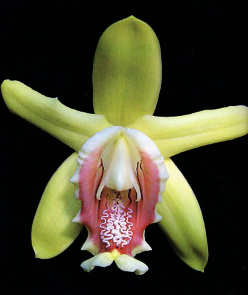 Found in Costa Rica and Boca del Toro province of Panama in cloud forests at elevations around 1750 to 2000 meters as a medium to large sized, cool growing terrestrial with thick erect stems enveloped by verruculous, glabrous sheaths and carrying various, elliptic, acuminate, thin, somewhat plicate leaves that blooms in the late spring on a terminal, 2 to 2.4" [5 to 6 cm] long, 2 flowered inflorescence carrying large showy yellow flowers with a purplish lip.