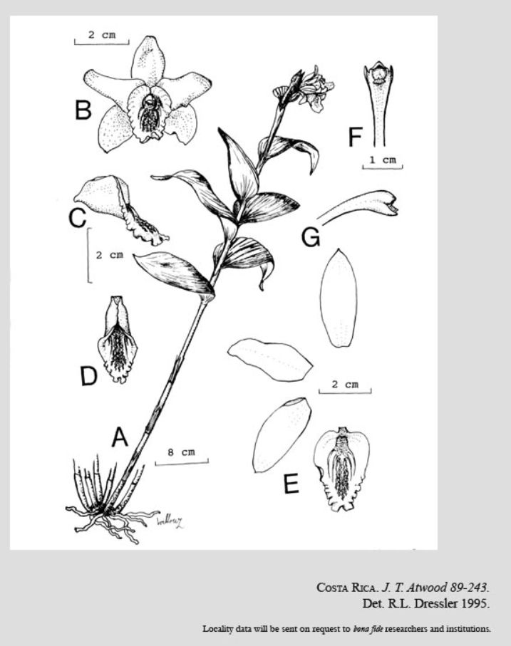 References W3 Tropicos, Kew Monocot list , IPNI ; Field Guide to the Orchids of Costa Rica and Panama Dressler 1993 pg 322; *Novon 5: 142 Dressler 1995 drawing fide; AOS Bulletin Vol 73 #10 2003 photo fide; Manual de Plantas de Costa Rica Vol 3 Hammel, Grayum, Herrera and Zamora 2003; Pl. Syst. Evol. 303: 868 Baranow, Dudek & Szach. 2017