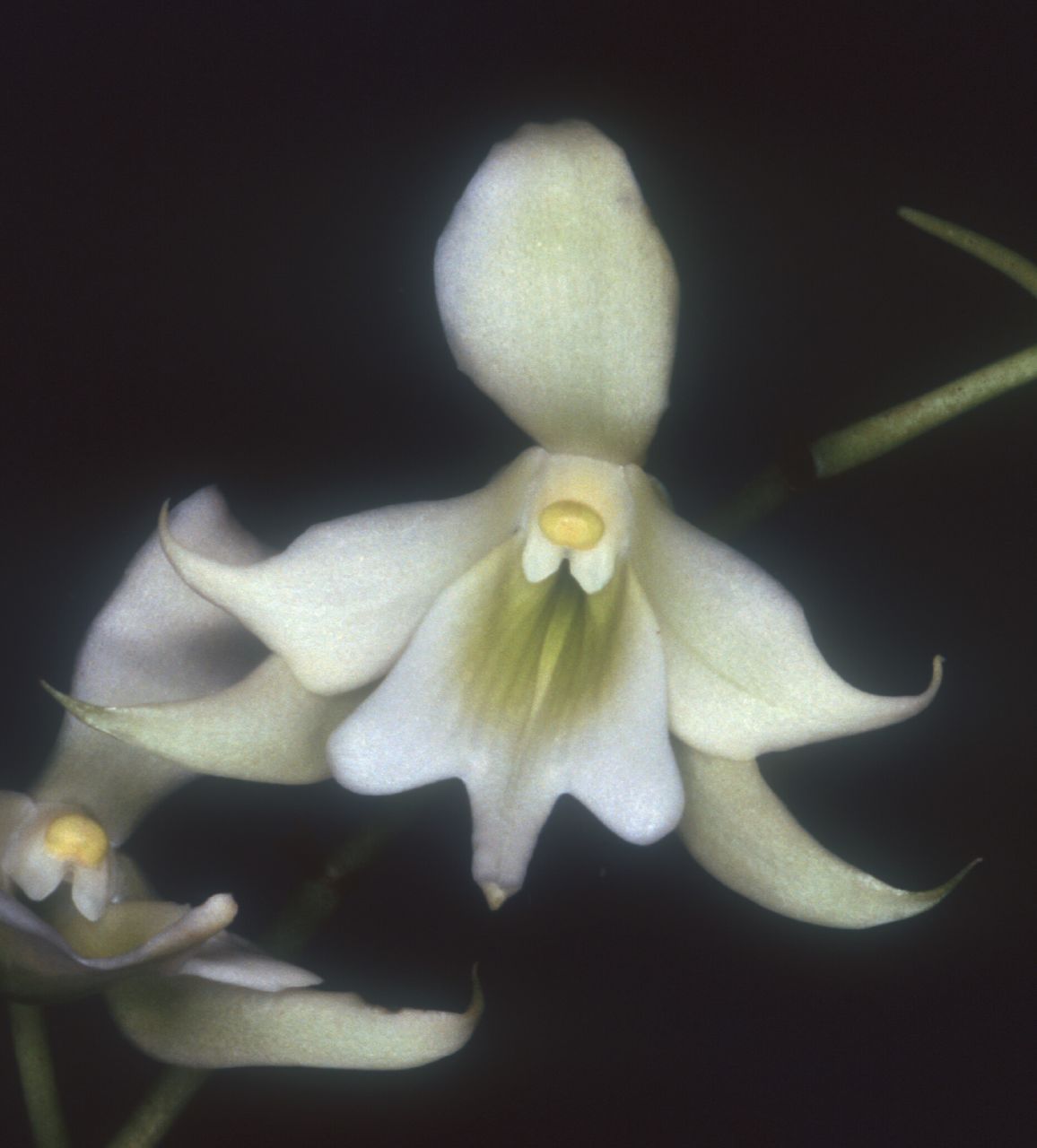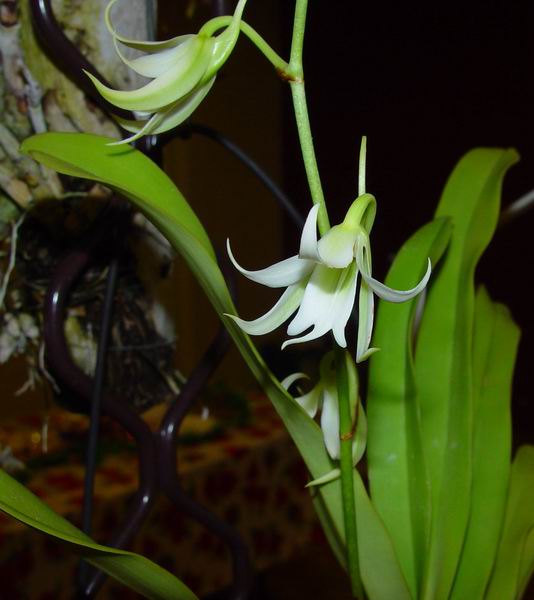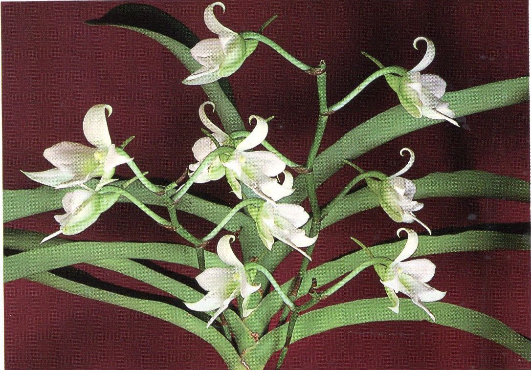 Found only in Madagascar at elevations of 400 to 1200 meters growing among rocks in seasonally dry evergreen forests [morning dew is the main source of water for part of the year] as a medium sized, warm to cool growing epiphyte or semilithophytic vandanaceous orchid with husky, basal roots and ones to within 5" of the crown, with a stout stem carrying many leathery, longlasting strap shaped leaves with wavy margins that blooms in the spring on a 12" to 16" [30 to 40 cm] long, arching inflorescence with spicy, pleasingly fragrant flowers that turn apricot color with age