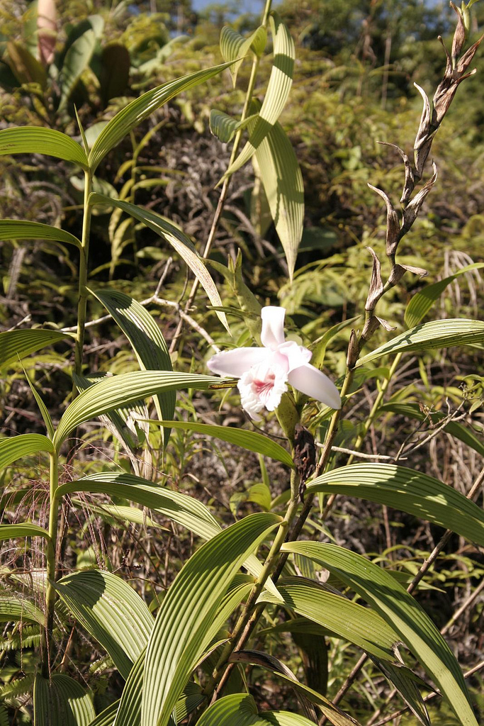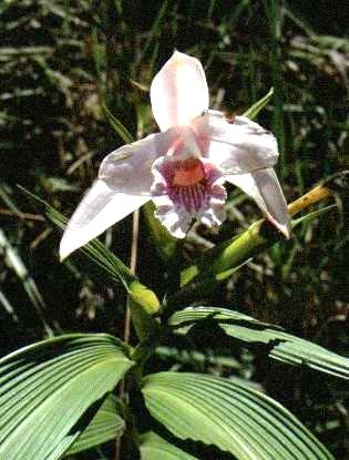 Found in Colombia and Ecuador in montane forests at elevations of 100 to 1700 meters as a large sized, hot to cool growing terrestrial on steep embankments at elevations of 220 to 1500 meters with cane-like stems carrying plicate, elliptic-lanceolate, basally clasping, acute leaves that blooms at any time of the year on a flexuous, elongate inflorescence with bracts as long as the ovaries carrying very large, successively single flowers