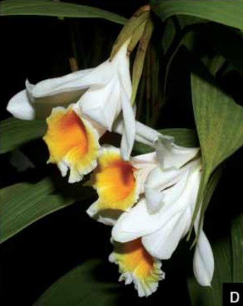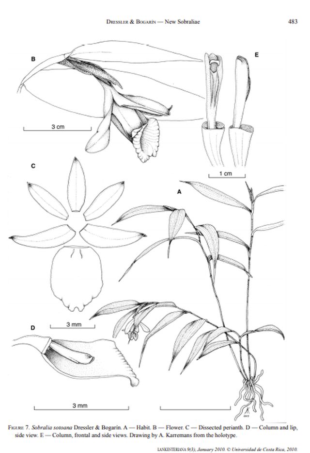 "Sobralia sotoana resembles S. aspera vegetatively, though the plant is a bit smaller. The upper stems are weakly but distinctly zig-zag, and the inflorescences much more markedly nodding, or reflexed, so the flowers are somewhat pendant. The flowers are a bit smaller and the lips are intense orange within with a narrow white margin." Dressler & Bogarin 2010