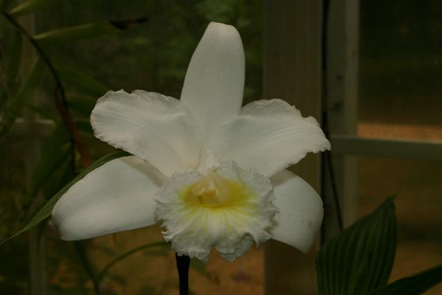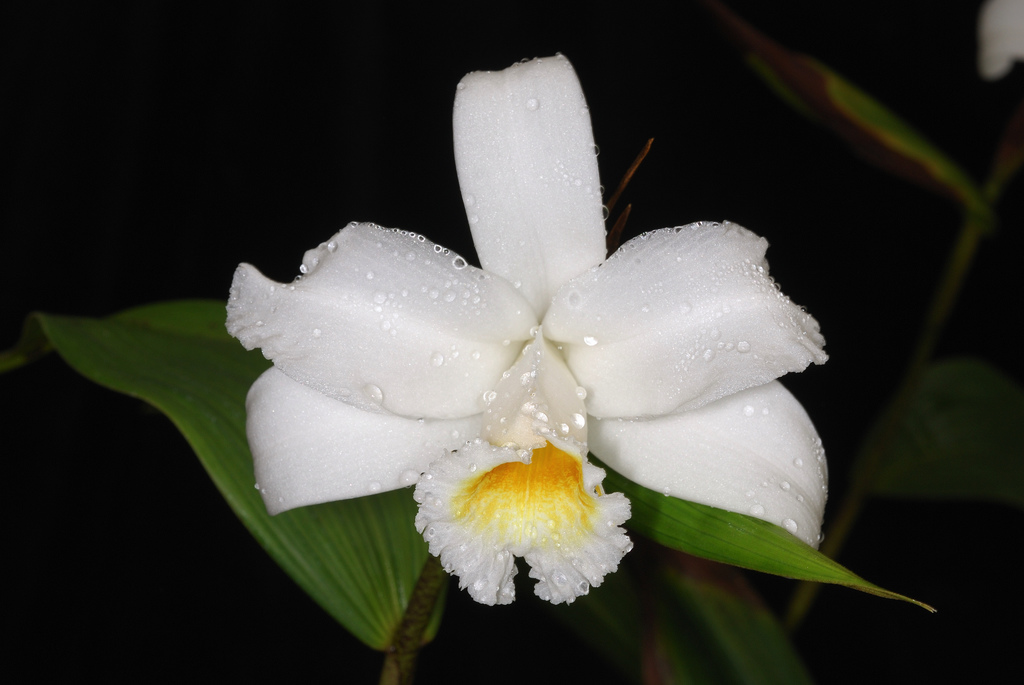 Found in western Colombia, Ecuador and Peru on rocky exposed slopes in wet premontane to montane forests at elevations around 1600 meters as a giant sized, warm to cool growing terrestrial orchid with thin, branching stems enveloped by tubular sheaths and building plantlets one on another and carrying the basally clasping, elliptic, plicate, acute leaves that blooms in the late winter and early spring on a terminal, sessile, single flowered inflorescence carrying a large, showy, fragrant flower