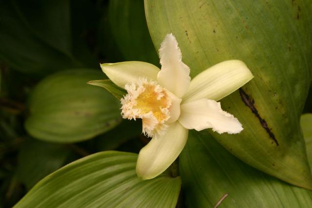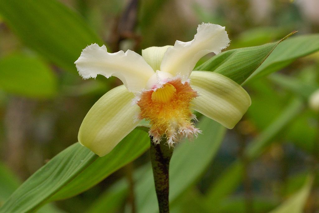 Found in Peru in tropical rainforests at elevations around 300 meters as a medium sized, hot to warm growing terrestrial with erect, unbranched, leafy stems enveloped below by loose, tubular, acuminate sheaths and carrying plicate, elliptic-lanceolate, acuminate, ribbed beneath, basally clasping leaves and blooms on a successively single flowered infloreasence carrying small flowers for the size of the plant.