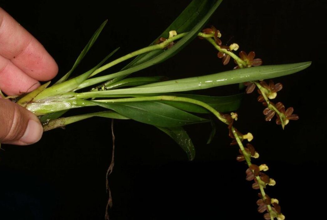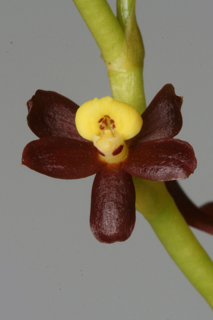 Found in Cusco department of Peru in wet cloud forets at elevations of 2800 to 3200 metrers as a small sized, cold growing epiphyte with caespitose, ovoid, ancipitous, slightly compressed pseudobulbs enveloped by 6 to 8 distichous, uppermost folaceous sheaths and carrying 1 to 3, oblong-elliptic to narrowly obovate, conduplicate, shortrly petiolate base leaves that blooms in the summer on an axillary, erect to suberect, slightly fractiflex, racemose, 5.6 to 6.4" [14 to 16 cm] long, 8 to 10 flowered infloresccence with conspicuous, as longas to longer than the pedicel and ocvary floral bracts and carrying non-resupinate, stellate flowers.