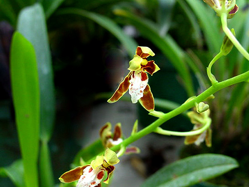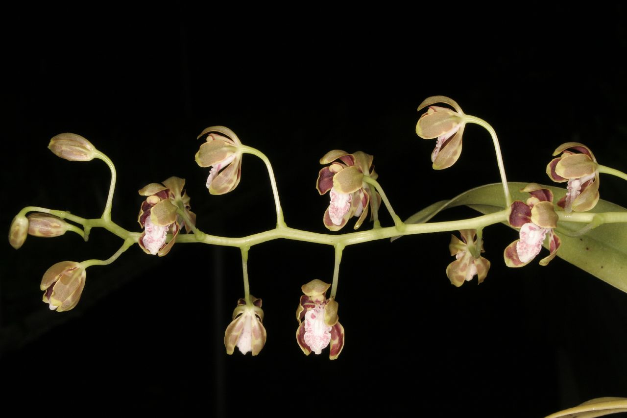 Found in Colombia and Ecuador in wet lower to middle elevations cloud forests onthe wesrtern slope fo the Andes at elevations around 800 to 1500 meters as a hot to warm growing epiphyte with caespitose, blunt, elliptic, more or less sulcate pseudobulbs subtended basally by 3 to 4, distichous, sheaths the uppermost foliaceous, and carrying a single, apical, erect, conduplicate, elliptic, acute, apiculate leaf that blooms in the later summer on an axillary, from the base of the uppermost sheaths, arching, to 6" [15 cm] long, 10 to 12 flowered inflorescence with adressed, scale-like much shorter than the ovary floral bracts and carrying slightly campanuate flowers.