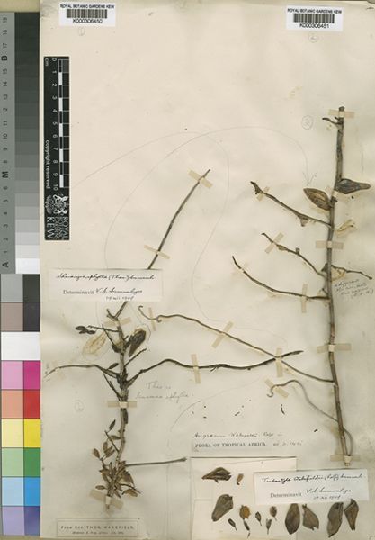 Found in Somalia, Kenya and Tanzania in coastal and lowland bush at elevations up to 300 meters as a large sized, hot growing scandent epiphyte with a shiney brown, elongate stem carrying many, lanceolate, unequally and acutely bilobed apically leaves that blooms in the spring on 1 to several, a along the stem, 1.6 to 2.4 [4 to 6 cm] long, laxly 4 to 6 flowered inflorescence carrying fragrant flowers