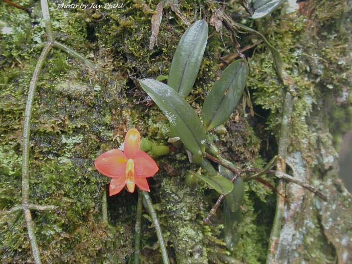 A miniature sized, cool to warm growing epiphyte or sometimes lithophyte from southeastern Brazil [Rio de Janiero to Rio do Sul States] mainly in the tropical coastal forest [mata atlantica] that covers the coastal mountain range [Serra do Mar] at elevations of 650 to 1670 meters in warm to cool montane forests on slender moss covered trees or on rocks in sheltered or exposed conditions, with fusiform, closely packed pseudobulbs with a single elliptic, erect, coriaceous, 2 1/2" leaf with the midrib being a red line, that blooms in spring and again sometimes in the fall on an apical, erect to arching, 1.2" to 3" [3 to 7.5 cm] long inflorescence with a single non-fragrant, long-lasting flower.