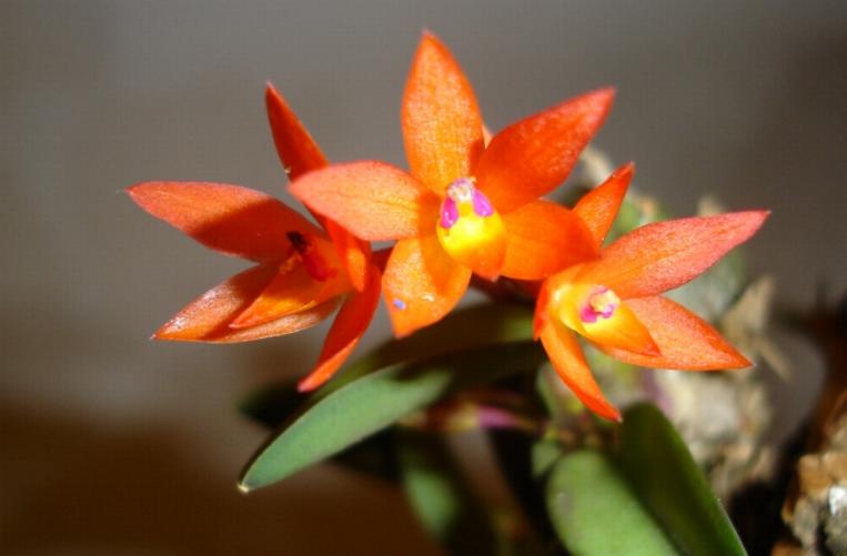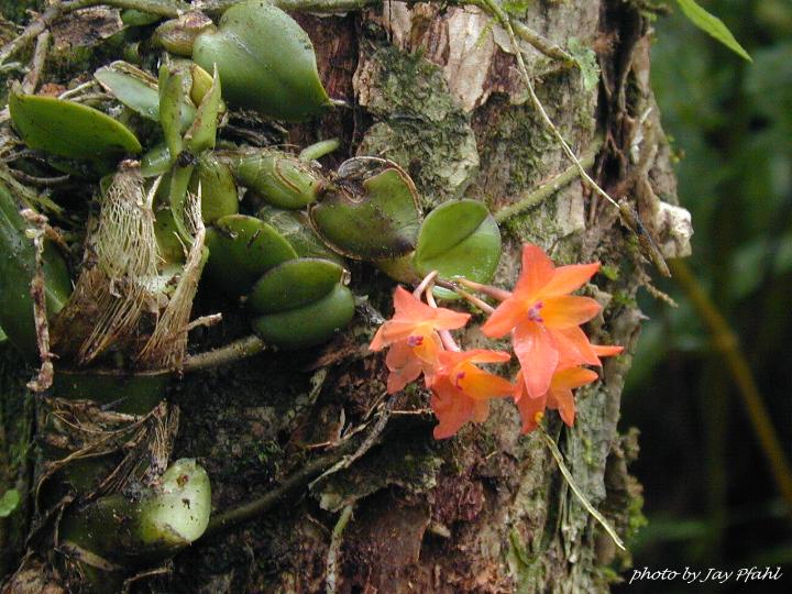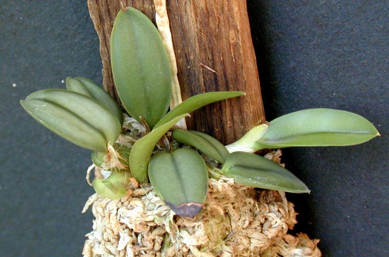 A miniature sized, south eastern Brazil species that can be found as far inland as Bolivia and Paraguay [S pterocarpa] and grows epiphytically and occasionally lithophytically as a warm growing orchid that has densely clustered, subcylindric or ovoid pseudobulb with 2 or 3 basal nodes and carrying a single, apical, thickly coriaceosu, broadly ovate or elliptic-ovate, obtuse or minutely apiculate leaf that blooms on a terminal, erect, 1" to 2" [2 to 5 cm] long, few [4 to 10] flowered inflorescence with nodding flowers occuring in the spring. Mount this species on cork and give hot to warm temperatures, bright light, high humidity, and year round water with less in cooler weather. This species is found at sealevel in Espirito Santo south to Sao Paulo state on rocky slopes or trees often so close to the sea that a slight salt spray can reach them. They can be found in Seaside mangrove hammocks and then as one goes inland on the littoral plain to the coastal foothilss can be found high above the canopy in lowland trees with full sun and a constant breeze so as to keep them dry even though they are in rainforest conditions. Temp can range from 50 to 110 degrees.