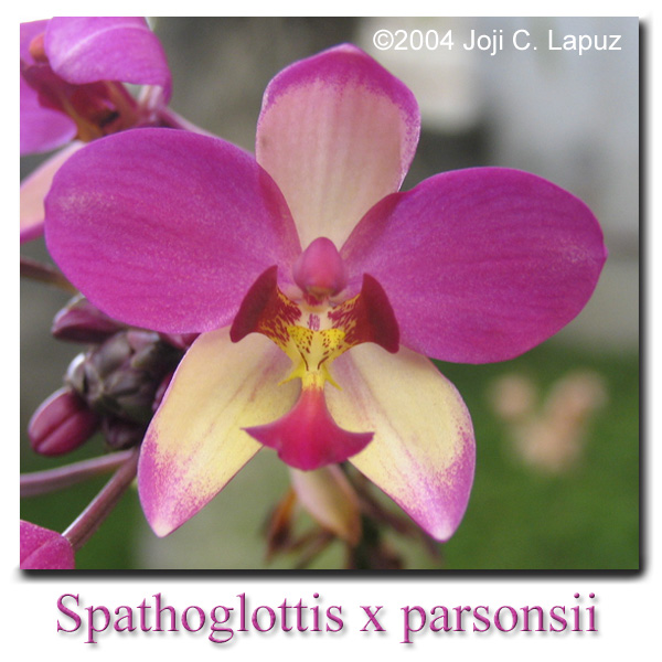 Spathoglottis x parsonsii (Ames & Quisumbing) is a natural hybrid first found in Baguio City in North Luzon in the Philippines. Its parent species are S. plicata and S. vanovergerghii, which are both common in this area. The flower shape is that of S. plicata but the downy inflorescence of S. vanoverberghii is apparent. Flower color ranges from salmon, pink, deep purple or yellow. It grows well in full sun and blooms between the cooler months of August to December. The planf has ovoid pseudobulbs carrying lanceolate to elliptic-lanceolate, acuminate, plicate leaves and blooms on a pubescent, 20" to 3'4" [50 to 100 cm] long, few flowered inflorescence