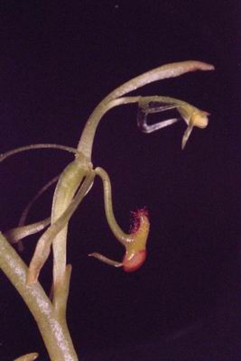 Found in Western Australia at elevations of 50 to 400 meters on granite outcrops and granite sheets in soil pockets as a miniature to small sized, cool to cold growing terrestrial with 2, dark green above, reddish purple below, narrowly elliptic to narrowly cordate, obtuse leaves that blooms in the later spring and summer on an erect, rigid, fleshy, brown, thickening and swelling towards the apex, 3.2 to 7.2" [8 to 18 cm] long, 2 to 6 flowered inflorescence.