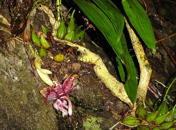 Found in Morelos, Mexico, Michoacan and Guerrero states of Mexico at elevations of 1700 to 2250 meters usually on sloping rocks as a medium to large sized, warm to cool growing occasional epiphyte, terrestrial or lithophyte that has obliquely ovoid-conical pseudobulbs enveloped basally by scarious sheaths and carrying asingle, apical, oblong to elliptic-lanceolate, acuminate, shortly petiolate, plicate leaves that has large fragrant, waxy flowers on a pendulous, stout, 2 to 3 flowered inflorescence with several papery, spotted sheathing bracts occuring in the spring and summer.