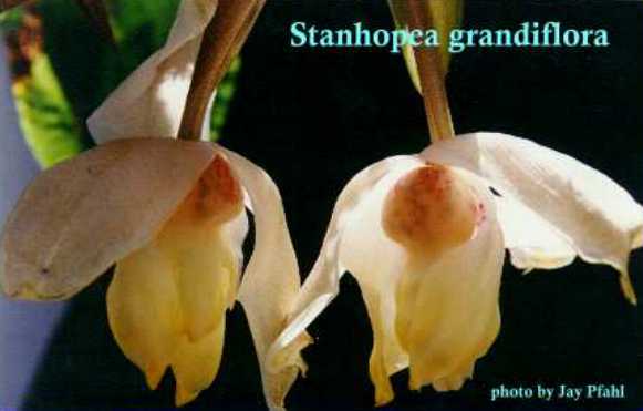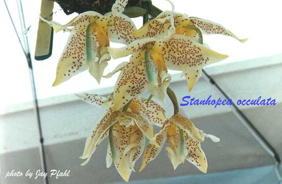 SUBFAMILY Epidendroideae, TRIBE Gongoreae, SUBTRIBE Stanhopeinae. From Mexico to Brazil this genus is hard to beat for it's size and beautifully odd, complexity, and there are 55 different ways that nature came up with presenting it to us. The ovoid dark green pseudobulbs with a single apical, heavily veined, petiolate leaf give rise to a inflorescence from the bottom of the pseudobulb and grows directly downward and for this reason they must be cultivated in a wire basket. The 1 to many flowered inflorescence have heavy mostly pleasing fragrance that can fill a house with it's scent for days. The parts of the Stanhopea Flower are shown here. The column {#1}, petals {#2}, epichile {#3}, Mesochile {#4}, hypochile {5}, horn {#6}, and the pedicel {#7}.
