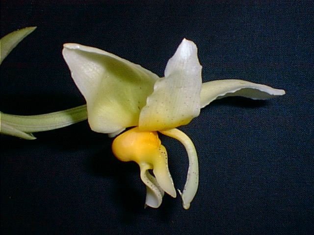Found in the north Pacific coast of Nayarit, Jalisco and Oaxaca states of Mexico on rocks or trees in oak and pine-oak forests at elevations of 200 to 1500 meters as a medium sized, warm to cool growing epiphyte with ovoid, crowded, apically truncated, rugose pseudobulbs partially enveloped below by scarious sheaths becoming fibrous with age and carrying a single, apical, plicate, erect, elliptic, acute, gradually narrows below into the sulcate, slender petiolate leaf that blooms in the late spring and summer on a pendent, basal, to 10" [to 25 cm] long, 1 to 3 flowered inflorescence enveloped by scarious sheathing bracts and having ovate,inflated sheathing floral bracts and carrying fleshy, waxy, fragrant [cinnamon] flowers..