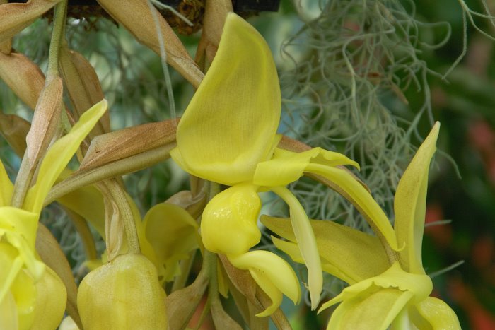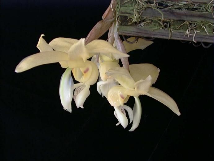 A medium sized, hot to warm growing epiphyte found in Costa Rica and western Panama in very wet tropical rain forests at elevations of 500 to 1400 meters with pyriform to ovate, sulcate pseudobulbs with a single apical, coriaceous, plicate, ribbed, elliptic-obovate, gradually narrowing belwo into the elongate, petiolate base leaf that blooms on a lateral, pendant, 4 3/4" to 6" [12 to 15 cm] long, racemose, several [to 8] flowered inflorescence arising on a mature pseudobulb that has large, chartaceous bracts, and fragrant short-lived flowers occuring in the summer.