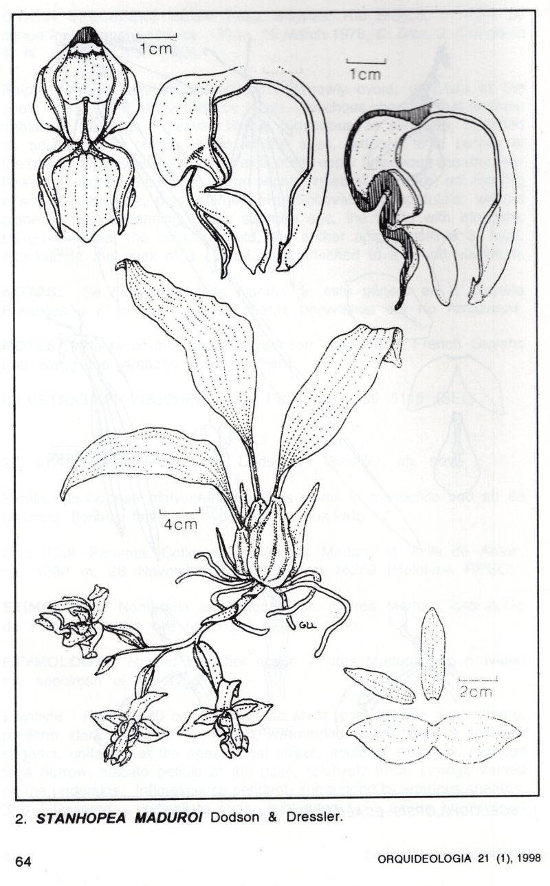 References W3 Tropicos, Kew Monocot list , IPNI ; *Orquideologia Vol. 21 No 1 Dodson 1998 drawing fide; AOS Bulletin Vol 68 No 12 1999 photo fide; Australian Orchid Review Vol 65 No 4 2000 photo; Rudolf Schlechter Die Orchideen Band 1C lieferung 37/38 pg 2309 - 2436 Brieger 1999; Caesiana 21 Stanhopea Part 1 Jenny 2003 photo/drawing fide; AOS Bulletin Vol 73 No 5 2004 photo fide